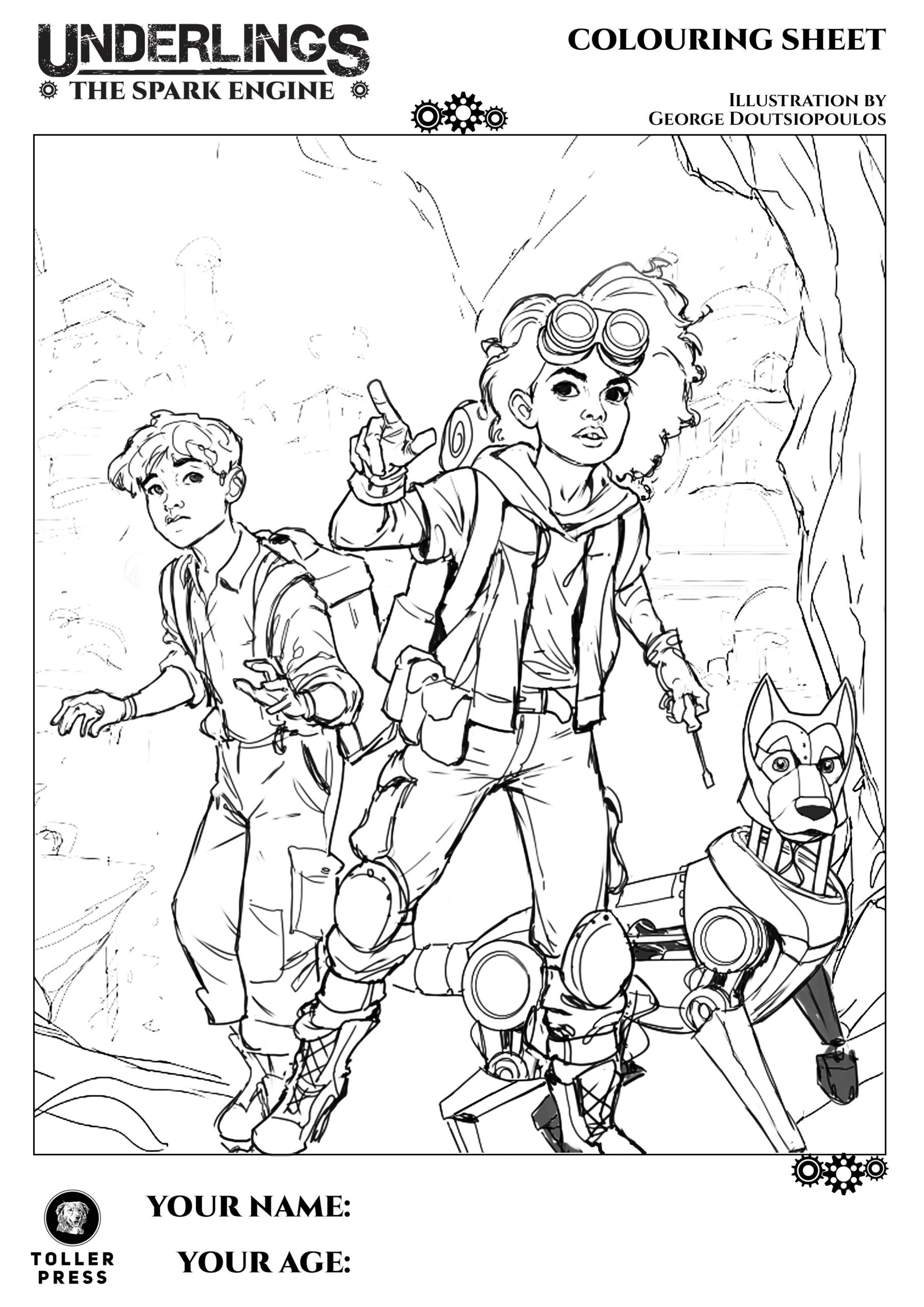 Line drawing of Evin, Kodi and Jet from the cover of the book, at A4 size, ready for colouring.